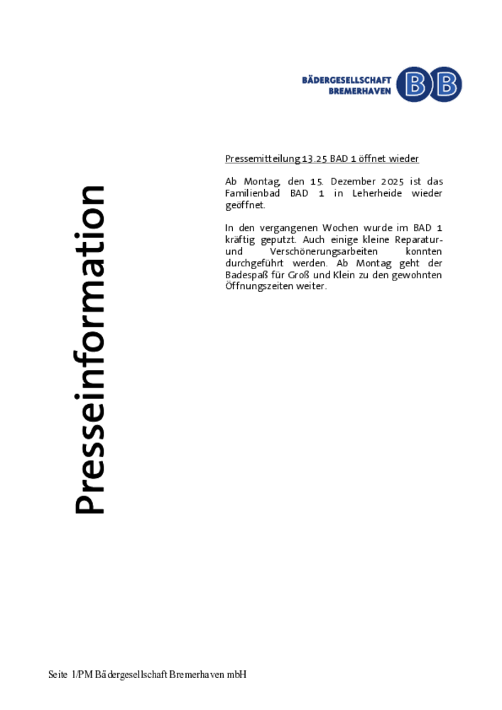 PM 13.25 BAD 1 öffnet wieder